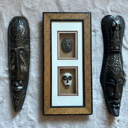 2 Dekorativa platta indonesiska masker i trä. Perfekt för att ge en unik touch till ditt hem.