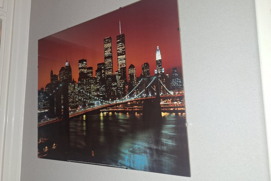 En tavla med motiv av en stadssiluett och en bro i förgrunden. Tryckt i Schweiz.