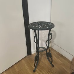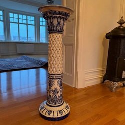 Piedestal med detaljerad design. Den har en rund topp och en stabil bas. Färgerna är guld, brun och beige.