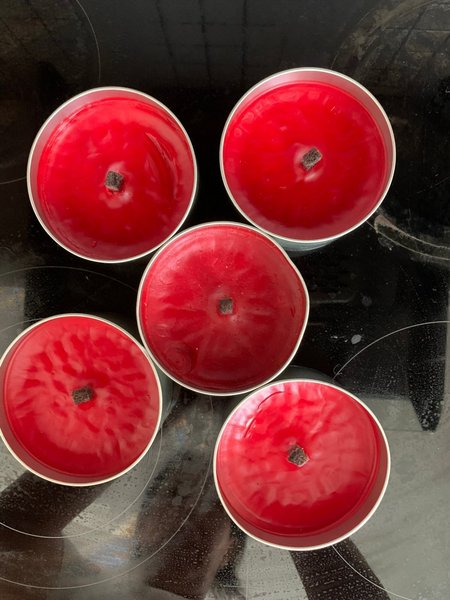 Set med fem röda ljus i metallbehållare. Perfekt för att skapa en mysig atmosfär i hemmet.