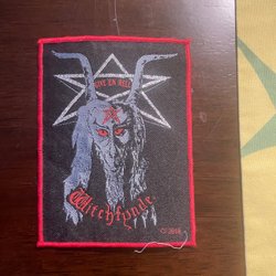 Stor tygpatch med motiv av bandet Tank och deras album Filth Hounds of Hades. Patchen har en röd kant och ett tryck med tre vargar.