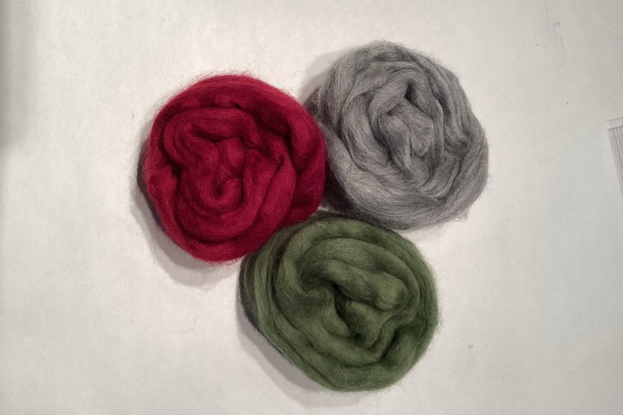 Ospunnen Merinoull (Tops) för filtning (tovning) tre färger, Grå, Mossgrön, Rubinröd