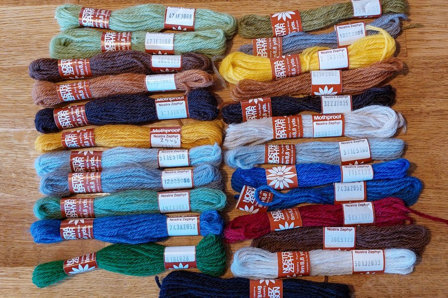 Nostra zephyr garn. 11 hela dockor, höger på bilden.12 påbörjade dockor, vänster på bilden