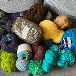 Restgarn, inkluder bomull, ull blanding och akryl. Det mesta är märkta. Inkluderar också 5 nya nysta med rött akrylgarn