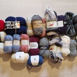 Stor flyttlåda med blandade garner av olika material. En del är helt nya och andra lite använda