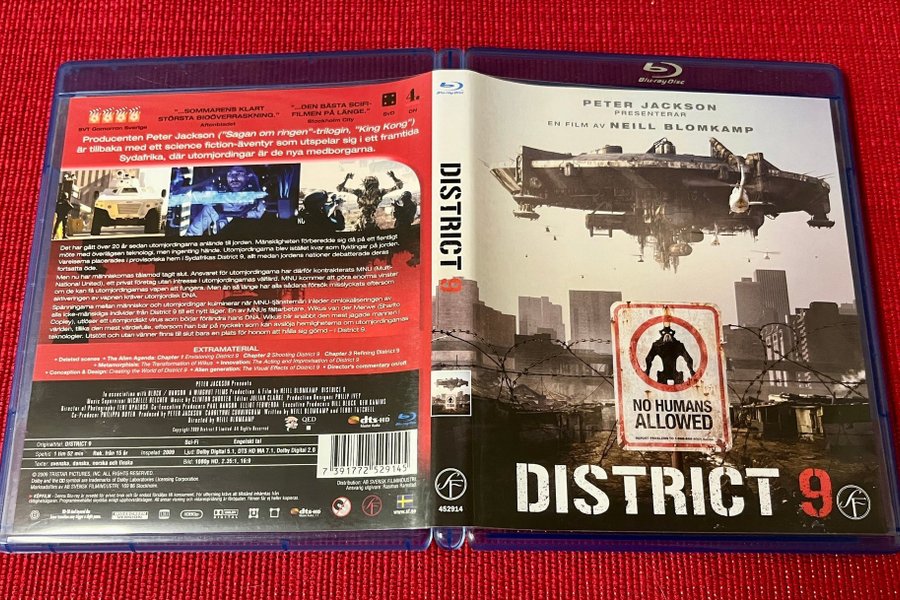 Blu-ray-utgåva av filmen District 9. Filmen är regisserad av Neill Blomkamp och producerad av Peter Jackson. Extramaterial inkluderar borttagna scener, The Alien Agenda, Metamorphosis, Innovation, Conception & Design, Alien Generation och regissörskommentarer. Ljudspår på engelska med Dolby Digital 5.1, DTS HD MA 7.1 och Dolby Digital 2.0. Undertexter finns på svenska, danska, norska och finska. Speltid är 1 timme och 52 minuter. Rekommenderad ålder från 15 år. Inspelad 2009. Bildformat 1080p HD, 2.35:1, 16:9.