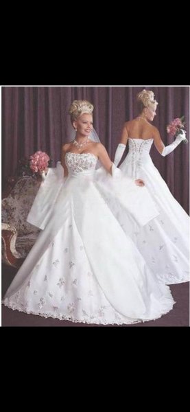 Elegant vit brudklänning med broderade detaljer på livstycket och kjolen. Klänningen har en vacker, svepande silhuett och ett snörliv på baksidan.