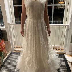 Denna eleganta brudklänning har en off-shoulder design med spetsärmar. Klänningen är utsmyckad med detaljerade broderier och paljetter på överdelen och kjolen. Baksidan har en snörning som ger en justerbar passform och en vacker silhuett. Klänningen har ett släp med spetsdetaljer som ger en sofistikerad touch. Använd 1 gång, behöver tvättas då det är lite smuts på släpet.