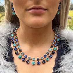 Halsband med rosa/vinröda toner, kristaller i 5 olika nyanser. Stensättningen är i raw mässing, kedja och lås är i guldpläterad mässing. Blandade kristaller Aurora, Preciosa, Swarowski, egen design. Guldpläterad mässing. Rose, Burgundy, Rose Peach, Light Rose, Light Rose Moonlight ss39 8mm, Längd 50cm inklusive lås och förlängningskedja. Tillhörande ring, armband och örhängen finns i lager.