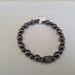 Ett stilrent armband med mattsvarta pärlor och Orm detaljer i silverfärg. Armbandet är elastiskt och har en omkrets på 15 cm. Tygpåse med följer