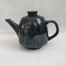 En sort tekande fra Rørstrand. Den har et bølgemønster nederst og et håndtag.