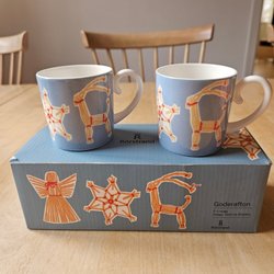 Två Rörstrand muggar med motiv från Goderafton serien. Design: Katarina Brieditis.