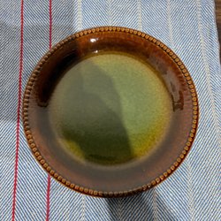 En keramik vas med blå och bruna toner. UE och numret 1399 är ingraverat på botten. Förmodligen från 1920-talet då liknande tillverkats och modellnumret visar att det är en ganska tidig vas från UE. Tror tekniken brukar kallas rinnglasyr.