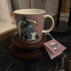 Muminmugg med motiv av Muminpappan som läser en bok i ett träd. Muggen är designad av Arabia.