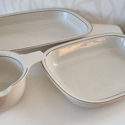 Säljer här tre fina delar ur Arabias Fennica servis, designad av Ulla Procopé & Rickard Lindh i början av 80-talet. De tre är en såskanna på ca 6 dl, två formar som mäter 36x26x6 cm resp 30.5x22.5x5.5 cm. Allt i helt fint skick. Perfekt kobination för att göra en snygg uppläggningen av maten till festmåltiden, smörgåsbordet eller varför inte julbordet (...snart är vi där)