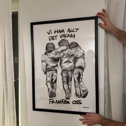 En unik tavla som fångar blicken. Den har en blandning av texturer och motiv, inklusive ett framträdande svart emblem i mitten. Konstverket är signerat och har en mängd olika detaljer som ger den karaktär.