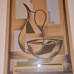 Målad tavla med motiv av träd och vatten. Färgerna är blå, grön, gul och orange. Tavlan är signerad.