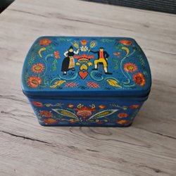 EN PLÅTBURK MED FINT MOTIV, D 20 CM, H 7 CM.