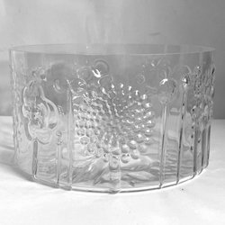 En stor skål i trä med flera träsnidade dekorativa äggformer. Skålens höjd 13 cm, diameter 26,5 cm. En tunn spricka undertill som delvis är genomgående.