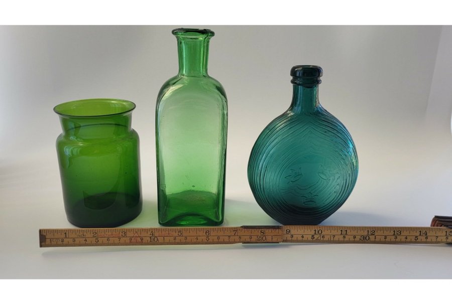 Tre gröna glasföremål, inklusive en vas och två flaskor. En av flaskorna är turkosblå med mönster.