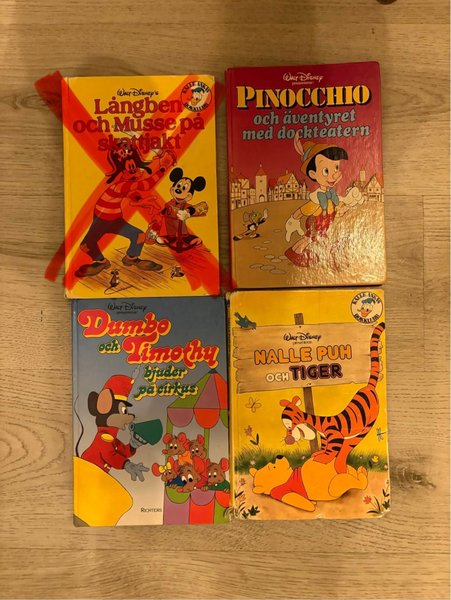 Tre stycken Walt Disney böcker: Pinocchio och äventyret med dockteatern, Dumbo och Timothy bjuder på cirkus, Nalle Puh och Tiger.
