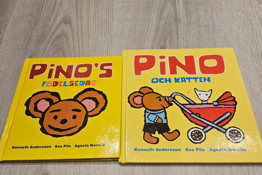 Två böcker om Pino. Den ena heter "Pino's Födelsedag" och den andra "Pino och Katten".