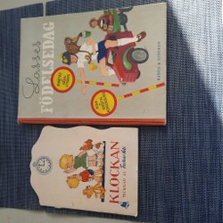 Två barnböcker: Lek och lär med motsatser (en glitterbok) och Den röda brandbilen (med ljud). Ljud signal funkar inte måste byta batteri.
