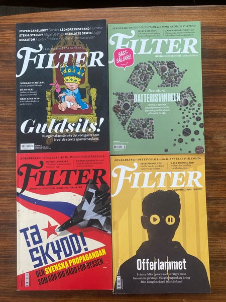 Fyra tidskrifter från Filter. Utgåvorna är från februari/mars 2012, juni/juli 2016, augusti/september 2016 och december/januari 2016/2017.