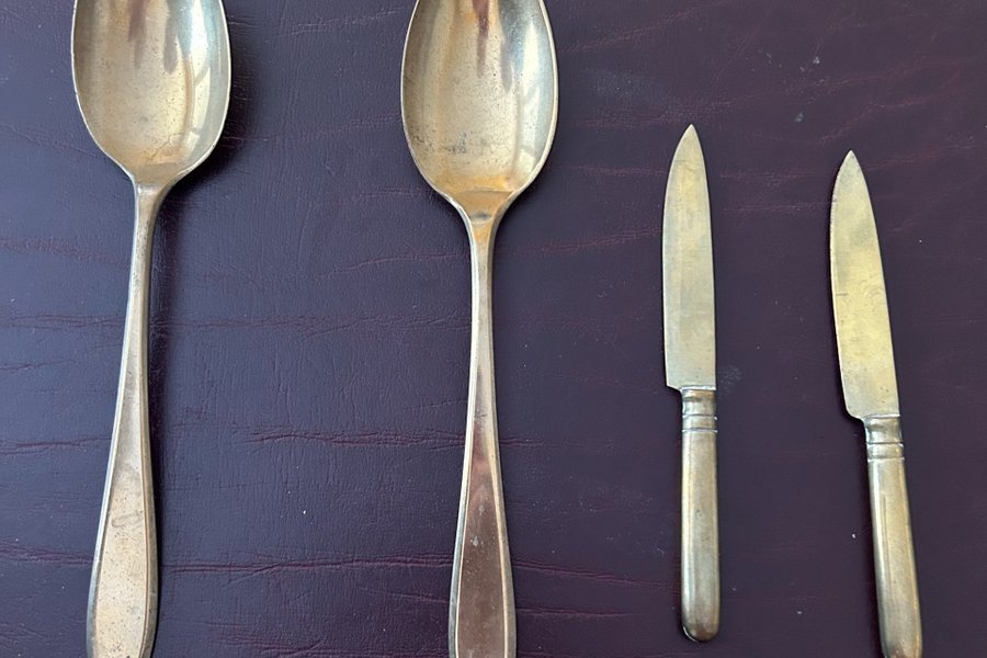 Två matskedar, 21,5 cm, och två fruktknivar, 14 cm, i den ovanliga legeringen Dirigold.