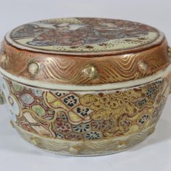 Denna runda träask är ett uttrycksfullt exempel på traditionellt hantverk med en lekfull twist. Den svarta högglanslacken kontrasteras av den röda mittsektionen och den handmålade figuren på locket, som troligtvis föreställer ett barn i traditionell japansk dräkt. Asken pryds även av en tofs med pärla – en detalj som både understryker dess kulturella uttryck och tillför en visuell balans. Passar utmärkt som smyckesask, presentförpackning eller förvaring av små föremål. Även ett uppskattat tillskott i samlingen av japanska eller asiatiska dekorföremål.