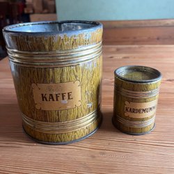 Några burkar av äldre modell säljes i befintligt skick. Marabou, Mazetti, Coop och Rumford.