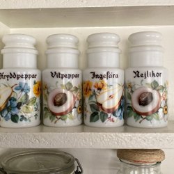 4 st oanvända kryddburkar i vitt opalglas. Inga skavanker, helt felfria, locken sluter tätt, höjd 12 cm.
