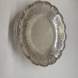 Dekorativ silverfärgad skål med detaljerade mönster. Perfekt för att servera frukt eller som en elegant inredningsdetalj.