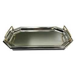 Silverfärgad bricka med dekorativ kant.