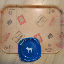 2 retro-brickor i metall/plast, grafiskt svart/vit