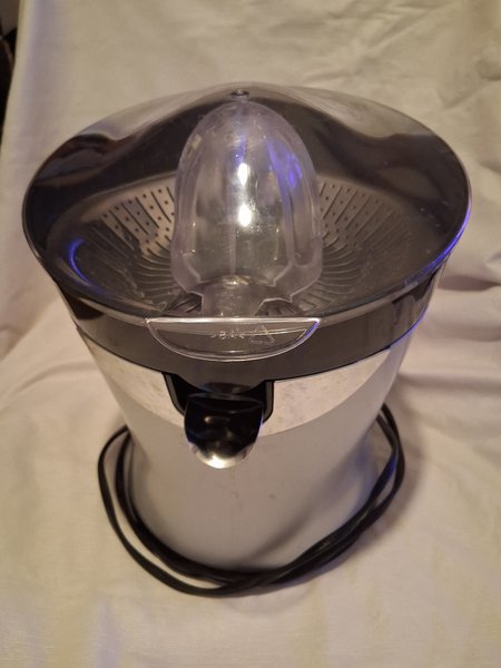 Citruspress för att enkelt pressa juice från citrusfrukter. Den har en transparent presskon och en uppsamlingsbehållare. Enheten är utrustad med en sladd för anslutning till elnätet.