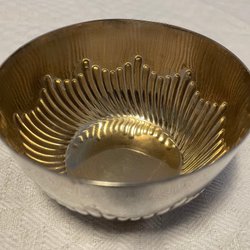 Saltströare i trä med topp av gul metall. Mässing? Knappt 9 cem hög. Bas 2,8 cm i diameter. Topp ungerfär 1,3 cm med fem hål. Målat ”S” på sidan 1,7 cm högt. Plastplupp i botten som kan tas bort för att fylla på salt. Salt ingår inte.