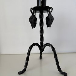 En dekorativ smidesljusstake i svart metall. Ljusstaken har en unik design med hängande löv som ger en rustik och elegant känsla. Perfekt för att skapa en mysig atmosfär i hemmet. Ca15 cm hög