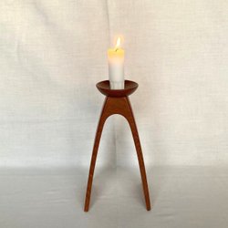 En ljusstake i trä med rund form och tre fötter.