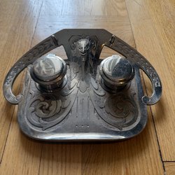 Detta är ett antikt bläckställ i gjutjärn eller brons föreställande en cowboy eller ryttare till häst.