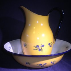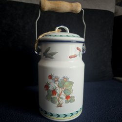 En kanna i ljusblått. Det finns en stämpel under och en ring mitt på
