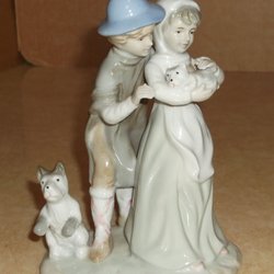 Figurin pojke med blå kläder som matar två vita gäss porslin