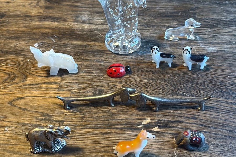 Ett sortiment av olika prydnadsföremål. Inkluderar elefanter i glas och sten, taxar i metall, hundar i porslin samt en nyckelpiga.