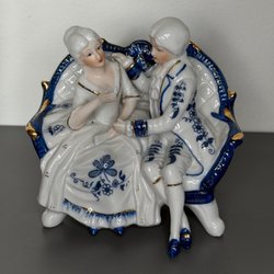 En vacker porslinsfigur föreställande ett par i tidstypiska kläder. Figuren är detaljrik och har fina färgnyanser. Perfekt för samlaren eller som en dekorativ detalj i hemmet.