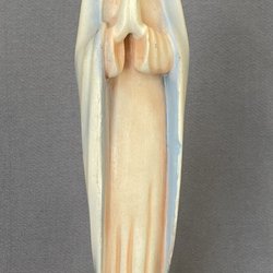Gammal madonna med barn och två ljushållare finns små märken på flera ställen syns på bilderna storlek höjd 27 cm bredd 10 cm.