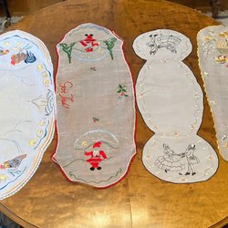 Två vackra broderade dukar med blommönster. Ca 42x27 Ser ut att vara tunt linne med ganska grovt grått brodergarn. Tror det heter Hardangersöm. Dukarna måste vikas om de ska skickas som brev.