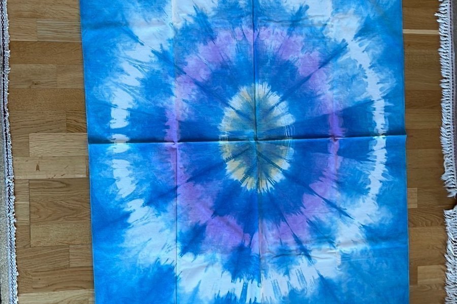 Färgglatt tyg med ett cirkelformat mönster i blått, lila, vitt och gult. 101x143