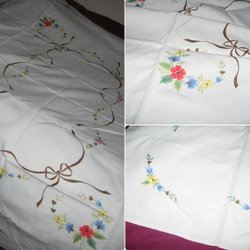Set med tre broderade dukar. En rektangulär duk med spetskant och blommigt broderi. En rund duk med blommigt broderi. En rektangulär duk med blommigt broderi. Den med spets har en skada som syns på bilden.