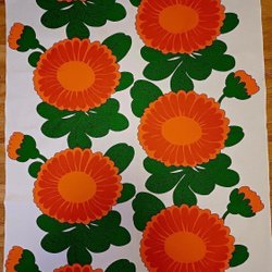 En alldeles fantastisk duk i rejäl bomull. Mycket bra skick. En diffus liten blå möjligtvis tryckfärgsrest bredvid en grön prick. Ej blekt. Se bild på fläcken som knappt syns.