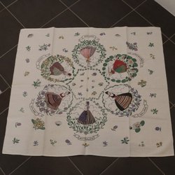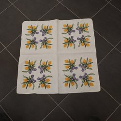 Fyrkantig duk med ett detaljerat blommönster i olika färger. Mönstret inkluderar stora blommor och blad samt mindre detaljer som pärlkedjor och små stjärnformade blommor. Dukenskant har ett dekorativt mönster som ramar in. Bomull. 41x 39,5cm.